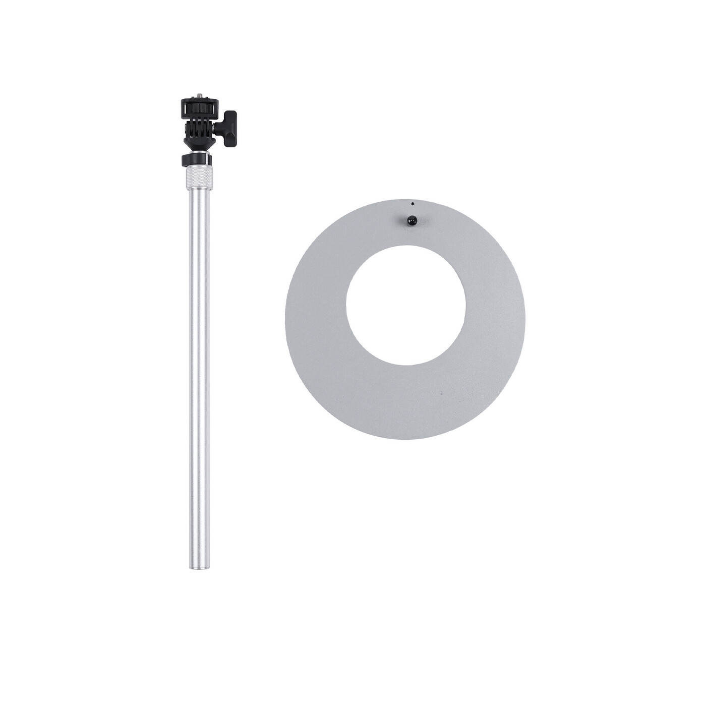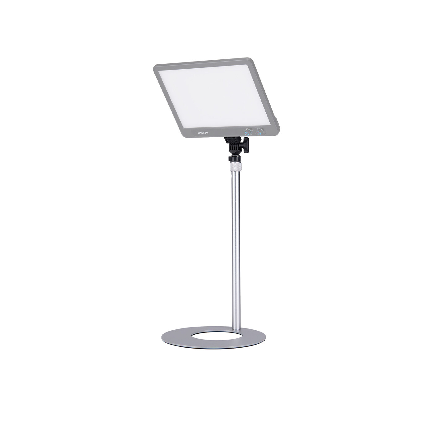 Den universelle 1/4"-20 skruefatning med locating pins sikrer kompatibilitet med et bredt udvalg af amaran-lys samt andre 1/4"-20-tilbehør. En justerbar tilt-mekanisme med låseknap muliggør præcis positionering – fra talking-head-opsætninger til top-down-indhold. Den vægtede stålbase med blød polstring i bunden giver øget stabilitet samtidig med, at den beskytter din arbejdsflade.