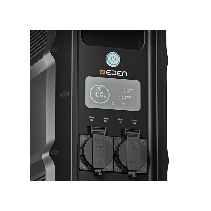 Featuring two AC outlets and four USB-C ports, EDEN keeps all your essential devices running smoothly, from lights and cameras to craft and catering. Its lightweight design, practical handles, and silent operation make it perfect for any environment, from production sets to rugged outdoor locations. The large 3.3” color screen provides real-time diagnostics, so you’re always in control.