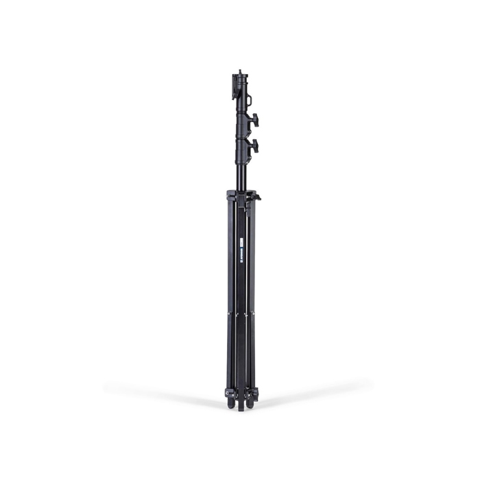 The A1035B Black Aluminium Combo light stand is a 3 section stand with 2 risers and features a mobile column that can reach a max height of 350 cm. This stand is complete with a levelling leg, captive locking T-Knobs and captive collars. The combo top Universal Head has a non-threaded 16 mm/ 5/8 in retractable baby spigot and a Junior 28 mm/ 1 1/8 in receiver.