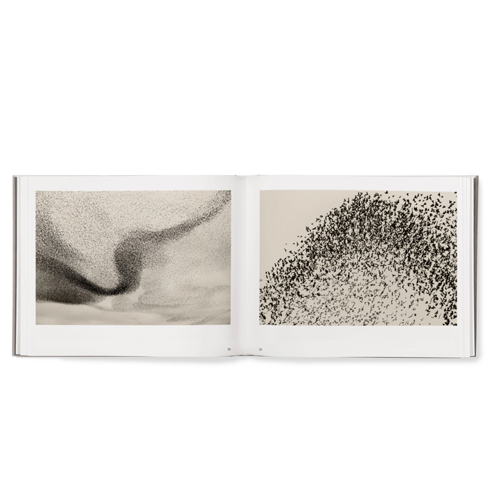 The starlings move as one unified organism that vigorously opposes any outside threat. A strong visual expression is created – like that of an ink drawing or a calligraphic brush stroke – asserting itself against the sky. Shapes and black lines of condensation form within the swarm, resembling waves of interference or mathematical abstractions written across the horizon. At times the flock seems to possess the cohesive power of super fluids, changing shape in an endless flux: From geometric to organic, from solid to fluid, from matter to ethereal, from reality to dream – an exchange in which real time ceases to exist and mythical time pervades. This is the moment that he have attempted to capture – a fragment of eternity.