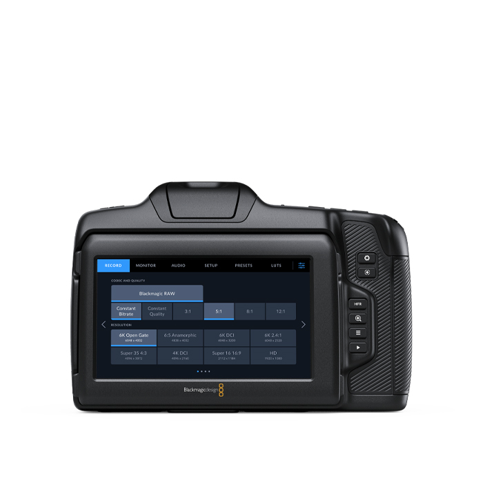 | Videoformat | Blackmagic RAW Constant Bitrate 3:1 Blackmagic RAW Constant Bitrate 5:1 Blackmagic RAW Constant Bitrate 8:1 Blackmagic RAW Constant Bitrate 12:1 Blackmagic RAW Constant Quality Q0 Blackmagic RAW Constant Quality Q1 Blackmagic RAW Constant Quality Q3 Blackmagic RAW Constant Quality Q5 H.264 Proxy in 1920 x 1080, 8-bit 4:2:0 |