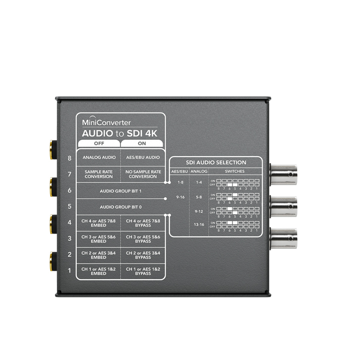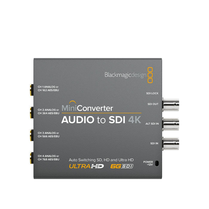 Mini Converter Audio to SDI 4K includes everything you need to embed 4 channels of analog audio or 8 channels of AES/EBU digital audio into any SDI video connection.