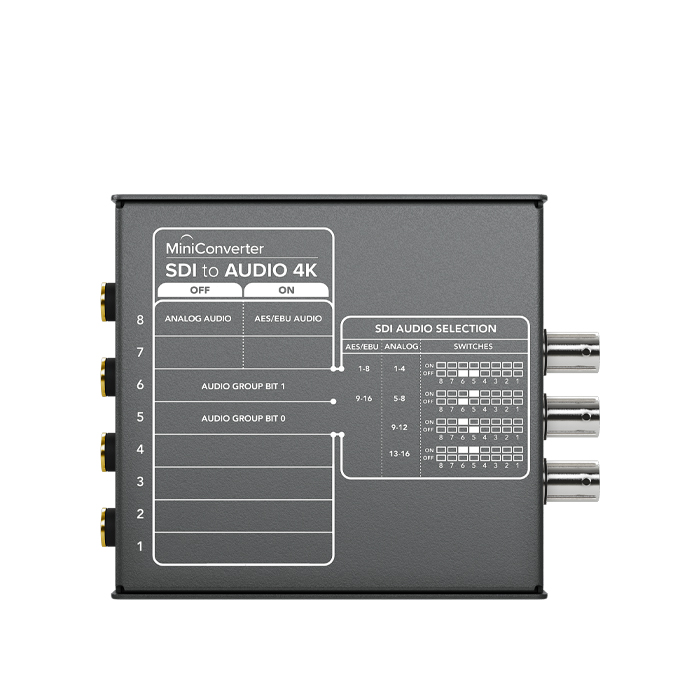 Mini Converter SDI to Audio 4K includes everything you need to de‑embed 4 channels of analog audio or 8 channels of AES/EBU digital audio from any SDI video connection. Now you can access the audio in any SDI video connection for output to a massive range of audio equipment such as audio mixers, analog broadcast decks, audio monitors and more.