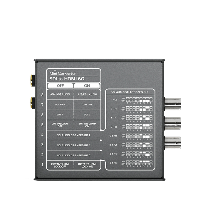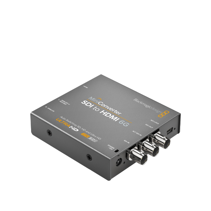 Mini Converter SDI to HDMI 6G lets you convert from SDI to HDMI in SD, HD, and Ultra HD formats while de-embeding audio to HDMI, AES/EBU or balanced analog audio.