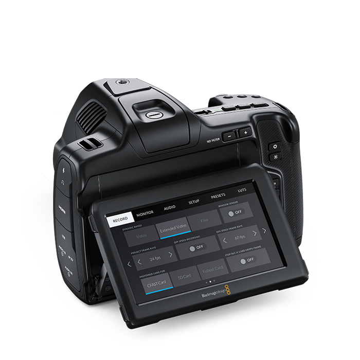 The Blackmagic Pocket Cinema Camera 6K Pro includes additional pro features such as built in 2, 4 and 6 stop ND filters, adjustable tilt HDR LCD with a bright 1500 nits that’s ideal for use in bright sunlight. It also includes two mini XLR audio inputs and a larger NP-F570 style battery.