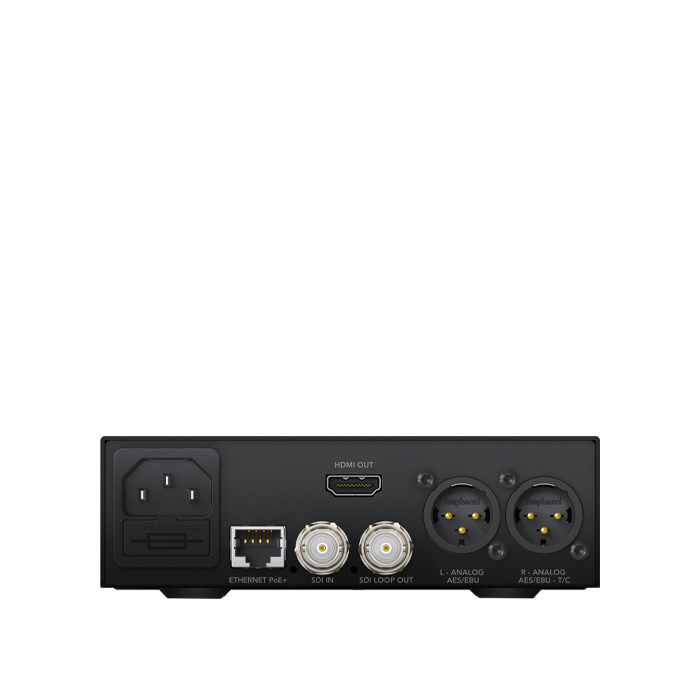 The front panel feels elegant when placed on a desktop plus it includes buttons and a color display for video monitoring with audio meters and video standard. The rear panel has Quad Link 12G-SDI for HD, Ultra HD as well as 8K formats.