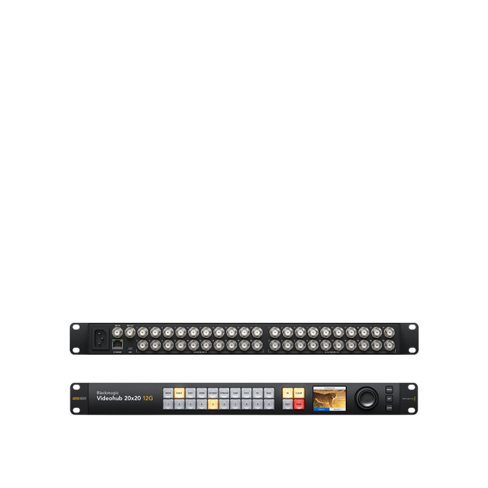 Blackmagic Videohub 20x20 12G is an advanced zero latency video router that supports any combination of SD, HD and Ultra HD on the router at the same time. It has 20 12G-SDI inputs and 20 12G-SDI outputs plus reference connections in a one rack unit size. The front panel LCD lets you see video before routing and clearly displays routing labels and video standards. Routing can be performed by direct button selection and using the large spin knob control that has an electronic clutch. It also features SDI re-clocking, external Ethernet control and supports all SDI video standards up to 2160p60.