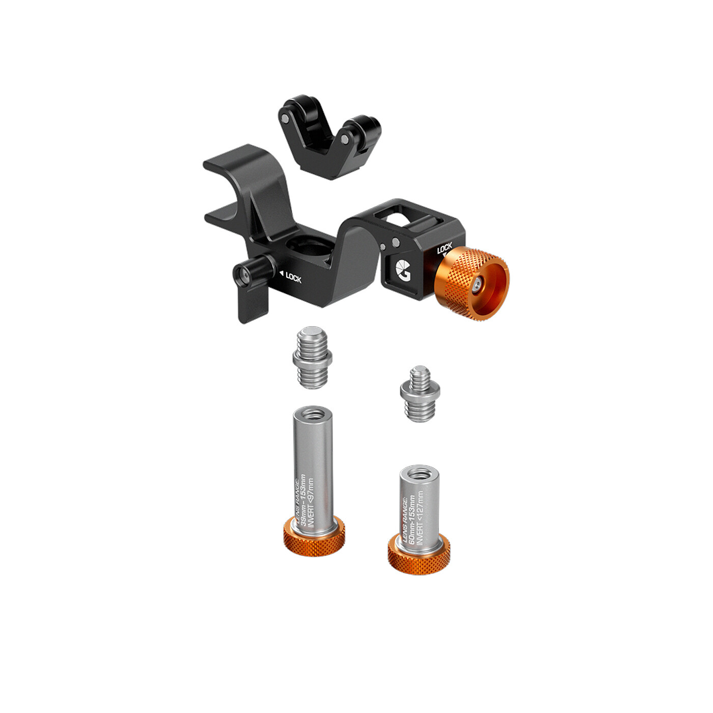 Til større objektiver med indbygget gevind medfølger en dobbeltsidet skrue, som sikrer kompatibilitet og stabil montering. Med både 1/4″ og 3/8″ mulighed kan du støtte næsten ethvert objektiv sikkert. Den centrale støtte kan skrues i objektivet før montering eller klikkes på og justeres i højden.