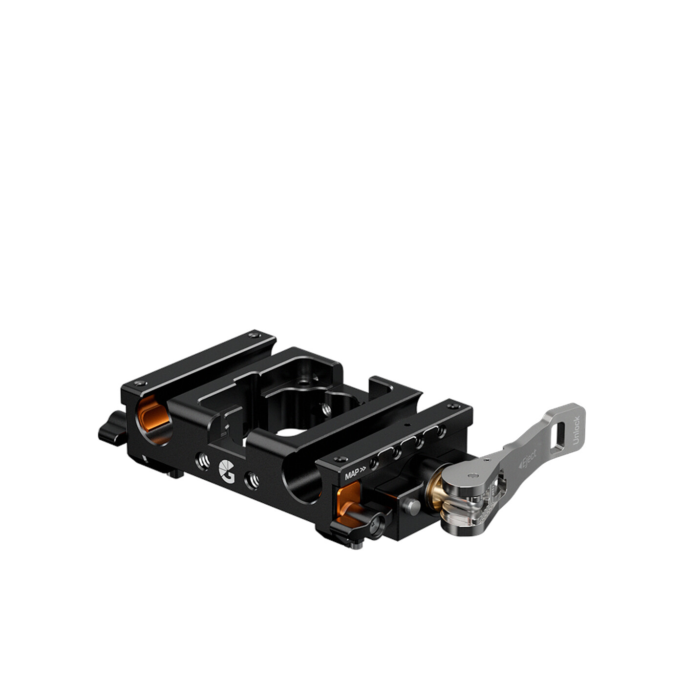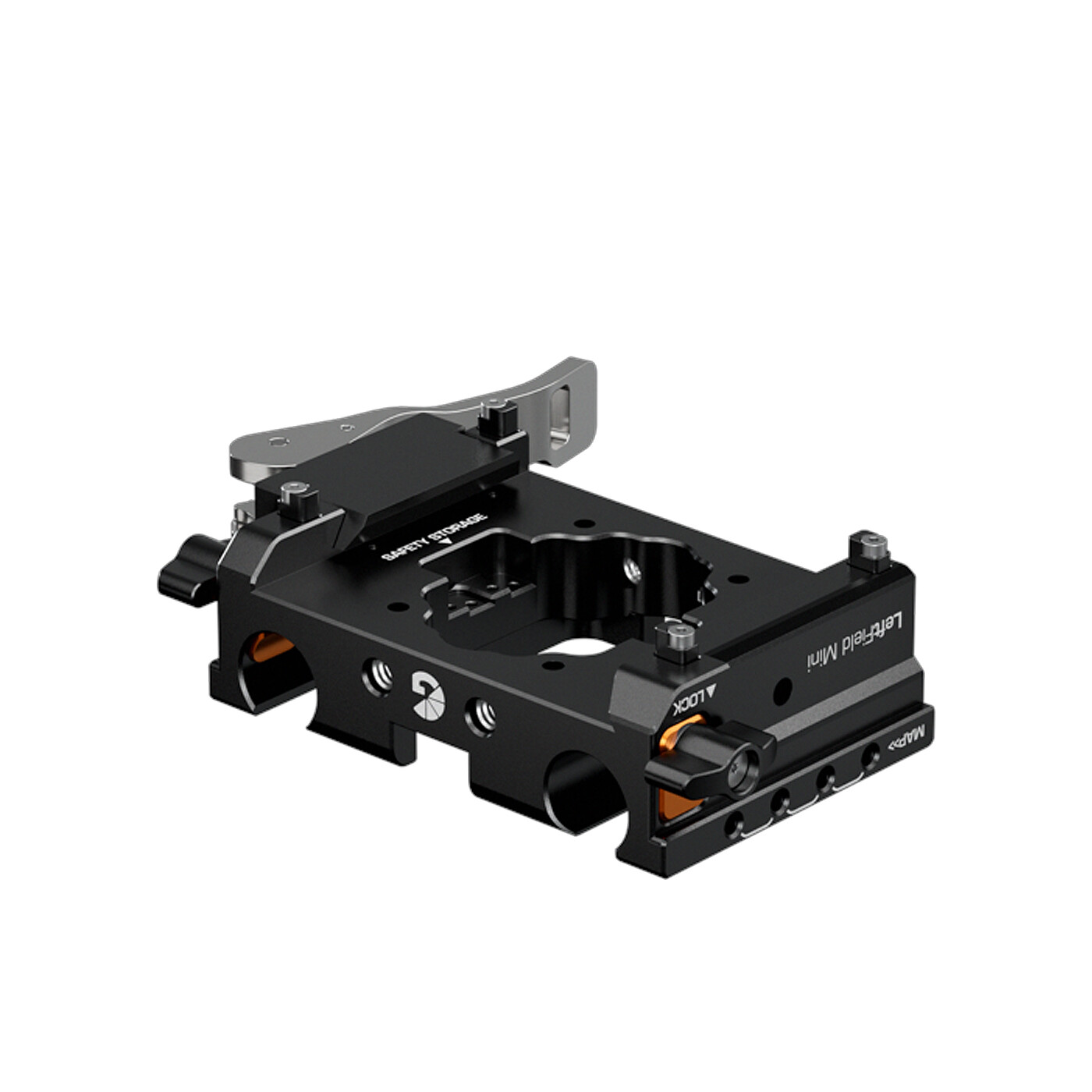 Selvom LeftField Mini er mere kompakt end LeftField 3 Baseplates, er den stadig udstyret med Bright Tangerines populære Open•UP-system for hurtig og nem quick-release. Det gør det muligt at montere LeftField Mini Baseplate direkte på enhver standard ARRI-dovetail på få sekunder. Når den er monteret, kan du bruge armen på siden til at skifte mellem låst, glidende og oplåst position på dovetailen.