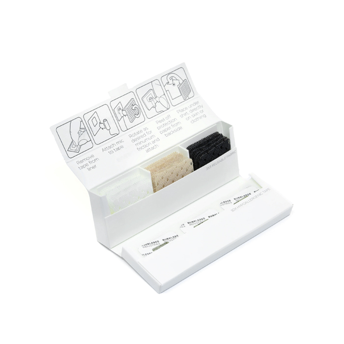 The transparent double-sided Invisible Lav Tape keeps your microphone and fabric solid in place on one side and sticks directly to the skin or to clothes on the other side allowing the microphone to be safely and securely mounted almost anywhere. It’s all about being creative: under the collar, next to a buttonhole, or under the clothes in the chest area.