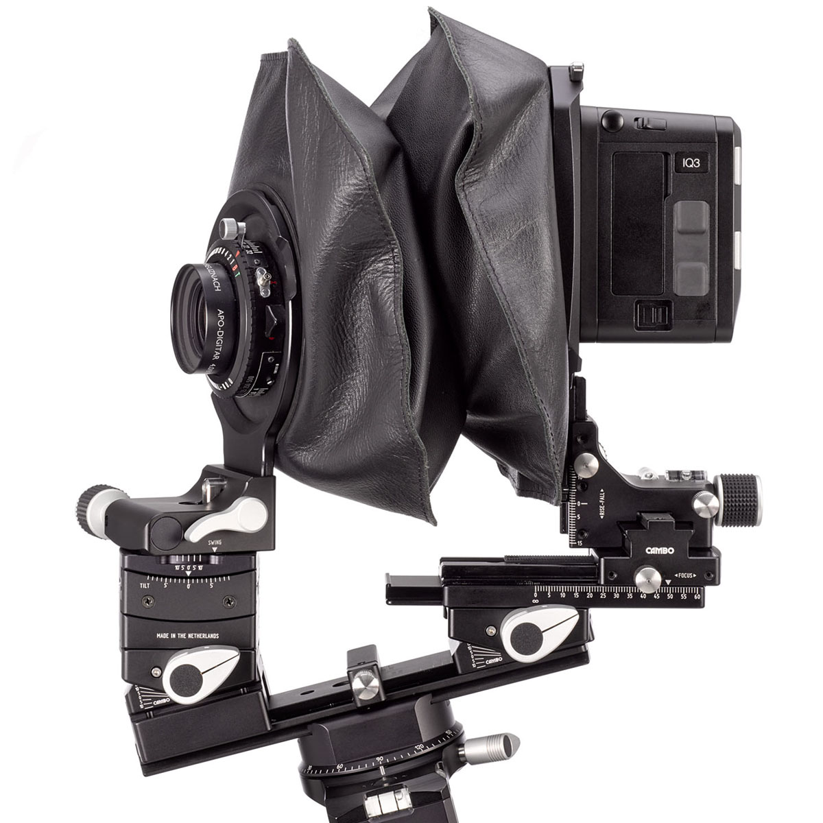 The rear base tilt unit mounts between the rear standard focussing unit and the monorail, and makes an extra layer of sliding focus too. An additionally included feature is that this layer allows for 42mm more focus draw, compared to the original configuration.