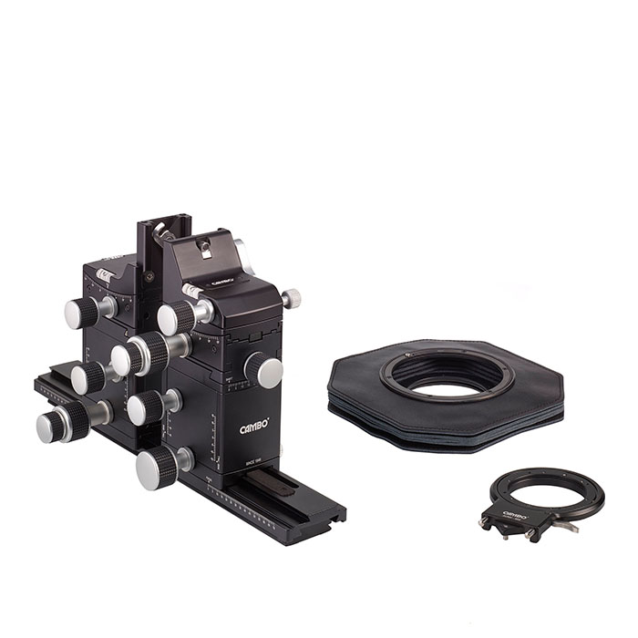 The Actus-MV base completed with the universal bayonet adapter ACMV-86e and bellows AC-214. ACMV-86e accepts a vast range of bayonets for mirrorless and DSLR cameras and features integrated rotation from landscape to portrait.