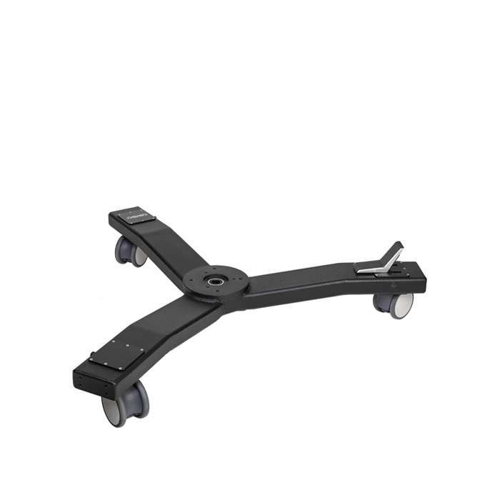 The MBU's base is a new design. It moves on large wheels which lock at the flip of a central pedal. Thanks to its large footprint and effective brake this will suffice for most applications. If needed (extremely uneven surface, medical applications) additional levelling feet with cranks are available.