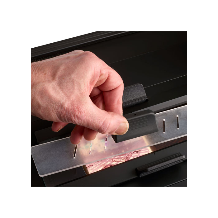 The Cambo Film Holders - ordered separately - feature an AN glass bottom plate. Film strips or sheets are kept flat by tensioners at both sides. This procedure enables maximum sharpness without putting too much pressure onto the film.