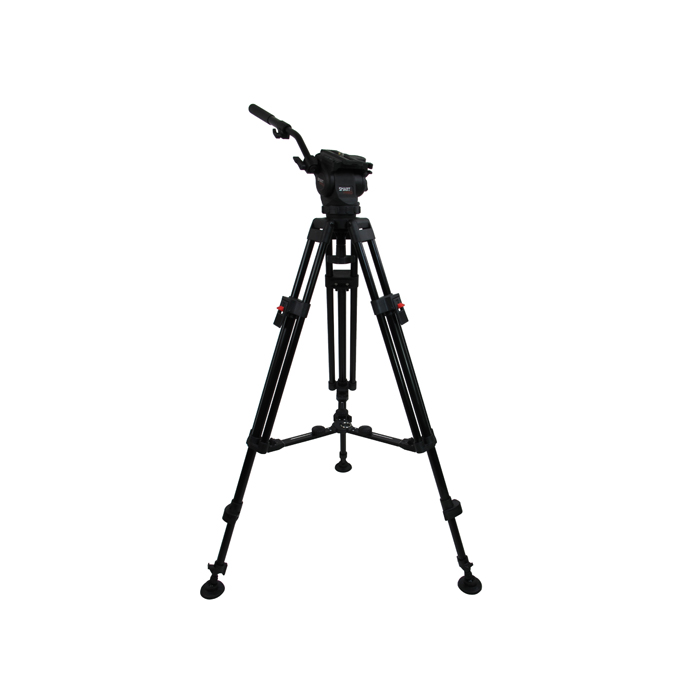 This is a kit consisting of a 2 staged aluminium DSLR/UHD tripod with mid-level spreader and rubber feet. It comes with a Smartpro fluid head assembled with 1 handle.