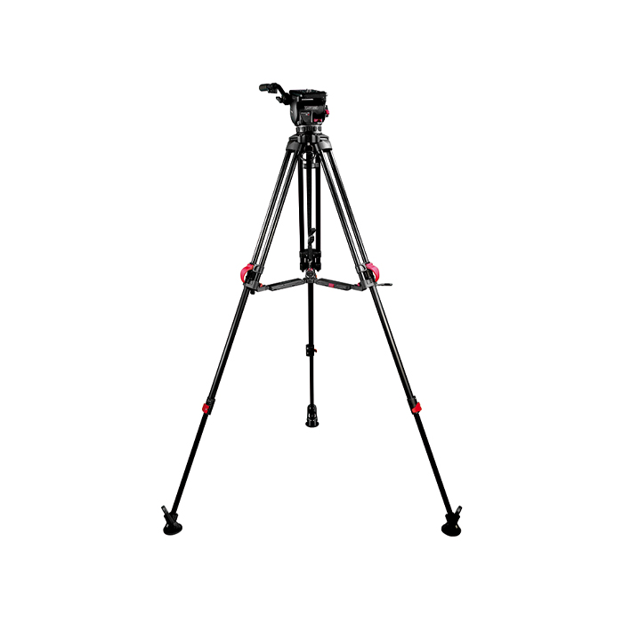 Focus 12 Fluid Head assembled with Red Lock Aluminum Tripod, Mid-level Smart Lock spreader, rubber feet and soft bag.