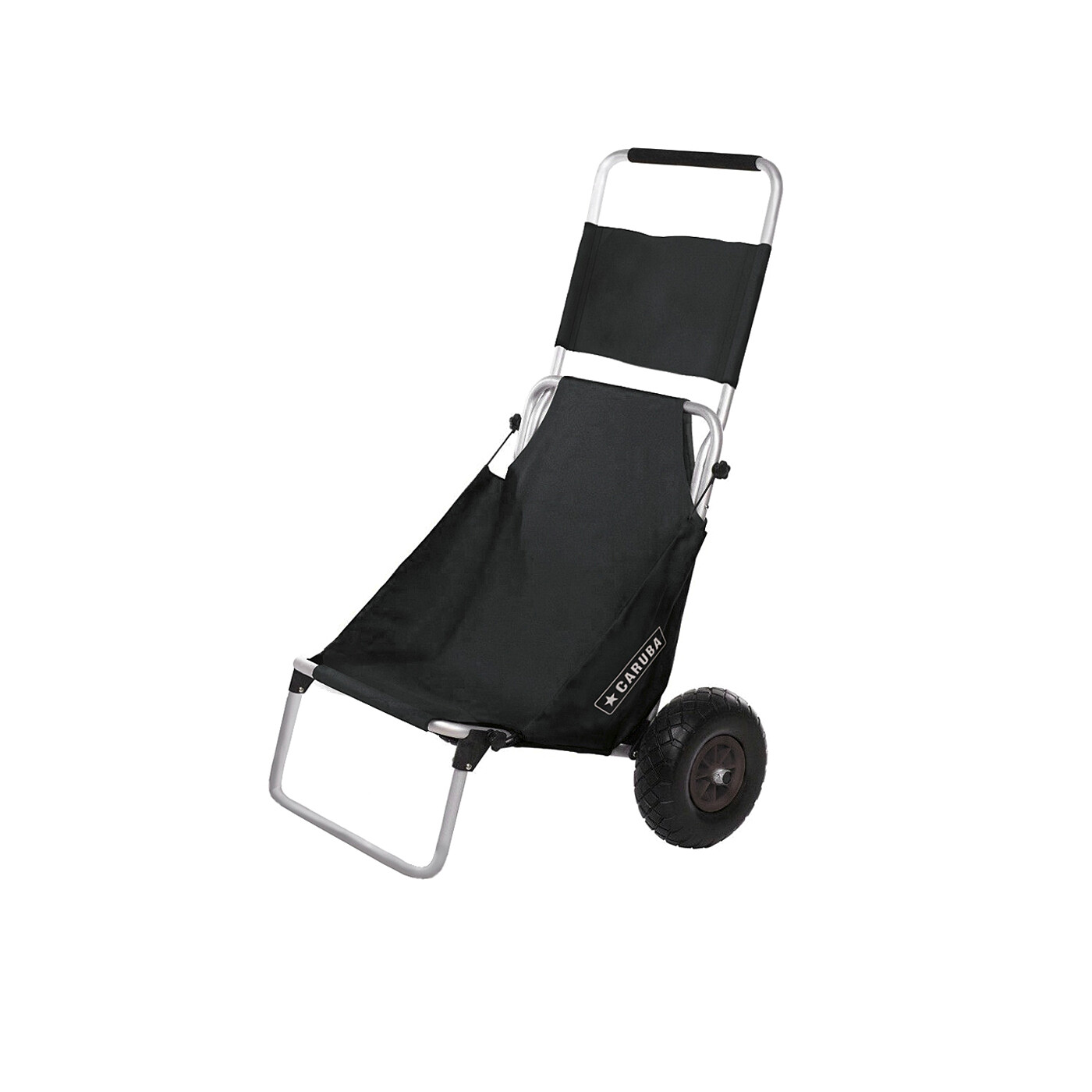 Vognen synker ikke ned på blødt underlag og kan bruges i ujævnt terræn takket være de brede, robuste hjul. Der er en lomme på bagsiden til tilbehør.