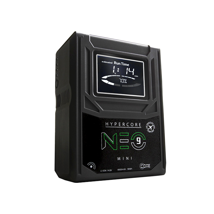 The Hypercore Neo 9 Mini, in a V-mount, from Core SWX is a compact 14.8V, 98Wh lithium-ion battery that supports a constant 12A draw and peak draw of 16A. With this high output, the battery is designed for cine and broadcast applications, but, of course, it can be used for virtually all other applications as well.
