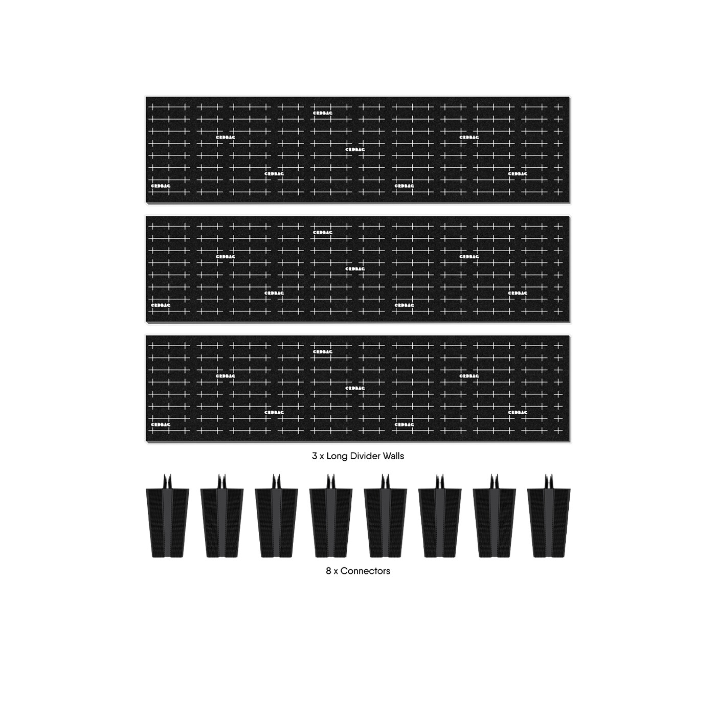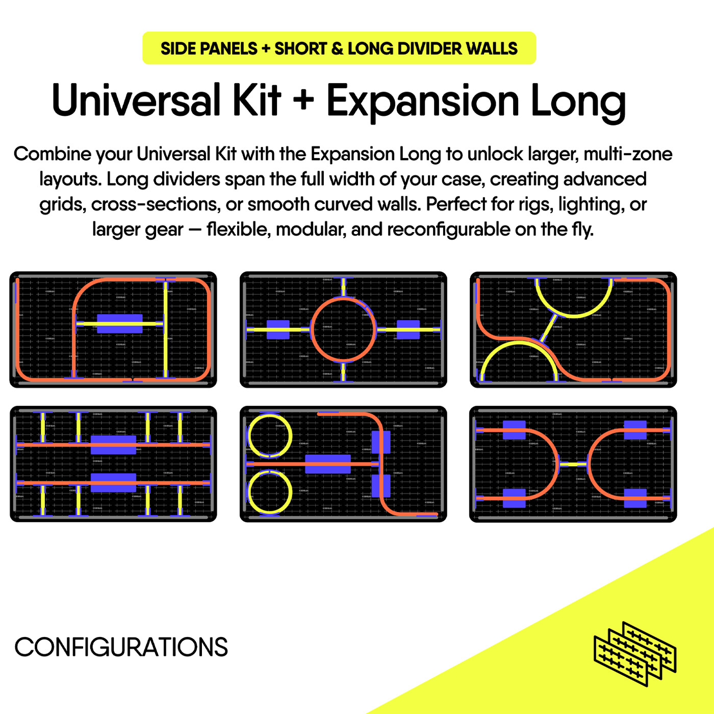 Expansion Long-sættet indeholder tre lange skillevægge (520 mm / 20,5") og otte forbindelser, ideelle til krydssektioner, buede vægge eller fuldbredde grids.