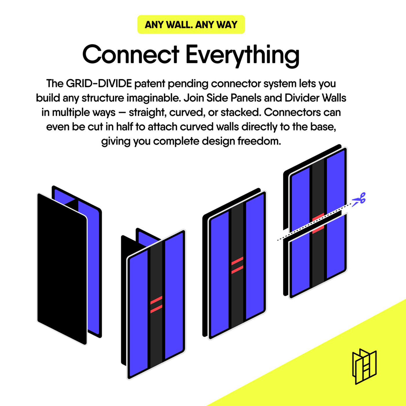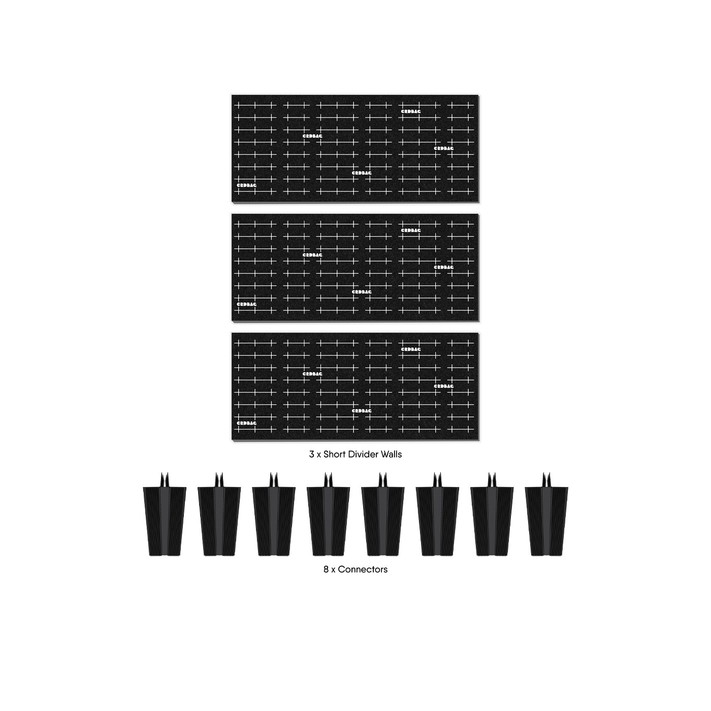 Opgrader dit GRID-DIVIDE Carry On Universal Kit med dette komplette short-wall expansion set. Sættet indeholder tre Velcro-kompatible skillevægge og otte solide forbindelser til opbygning af nye rum og modulære layouts. Hver væg har en trykt skæreguide for præcis tilpasning og omkonfigurering – ingen lim, ingen begrænsninger.