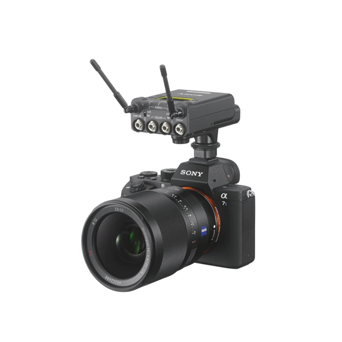The 2-channel wireless receiver URX-P03D can be attached to camcorders or interchangeable-lens cameras that have an MI (Multi-Interface) shoe using the 2-channel MI shoe adaptor SMAD-P3D.