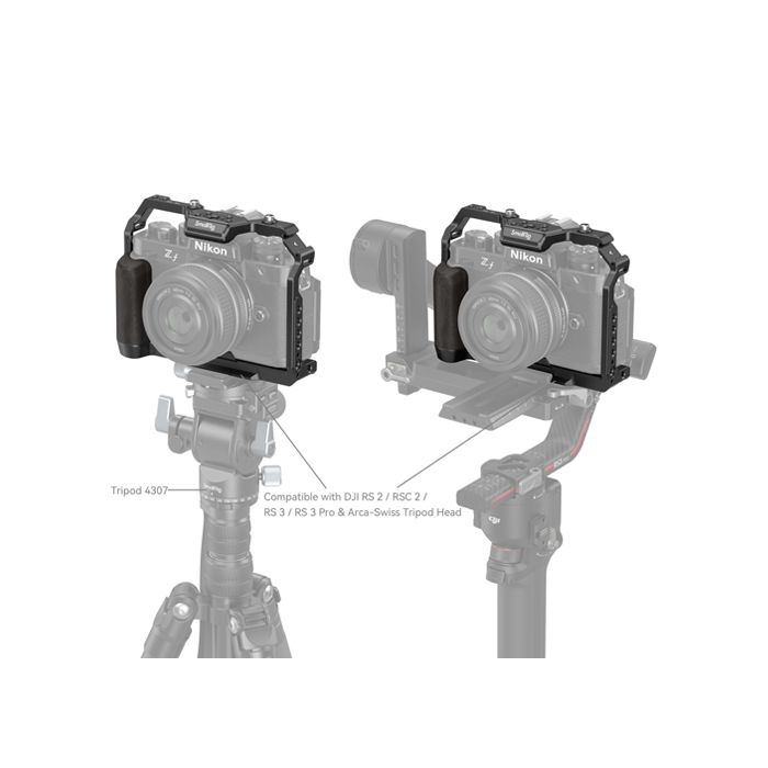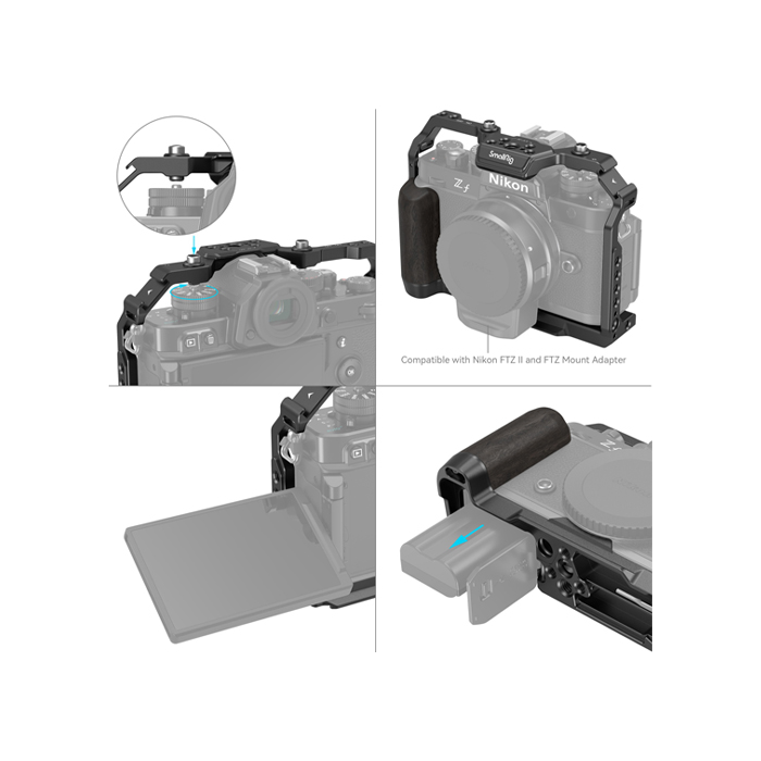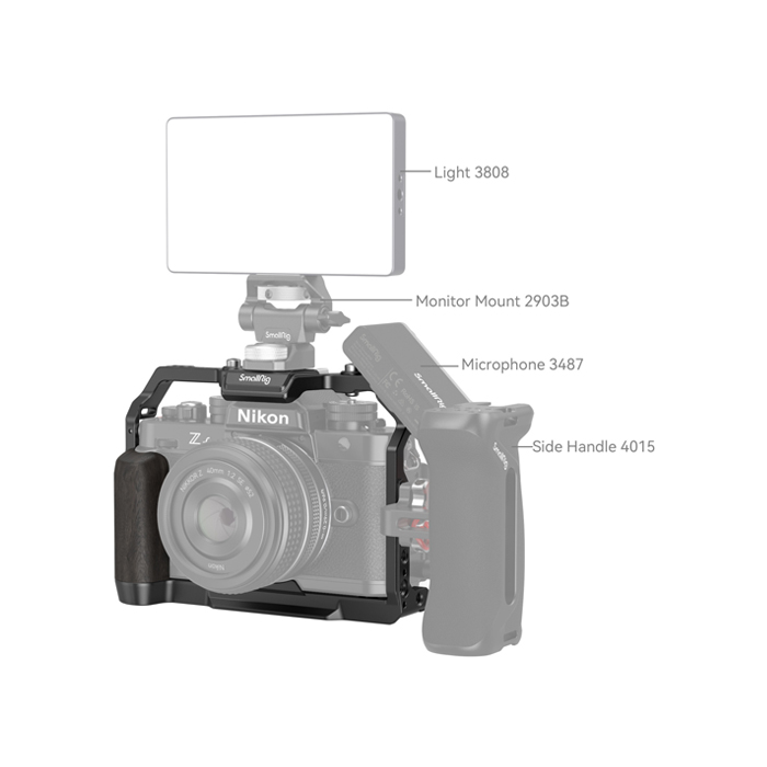 SmallRig 4261 Camera Cage for Nikon Z f is designed to protect the camera, attach accessories and improve grip. It locks Nikon Z f via one 1/4“-20 screw on the bottom and one M2.5 screw on the right, with rubber pads preventing scratches.
