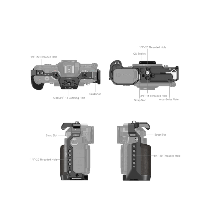 Among its mounting points, 1/4"-20 threaded hole, 3/8"-16 threaded hole, ARRI 3/8"-16 locating hole and cold shoe support Side Handle 2093C / 4016 / 3847, Top Handle 3765, Monitor Mount 2903 / 2904, mini V Mount Battery Plate 2987, Single Rod Clamp 3598, Magic Arm 3873, Microphone 3468, LED Video Light 4055, etc. Besides, there are strap holes for Hand Strap 3848 / 3926, Neck Strap 3485, QD mounts for Shoulder Strap 4118.