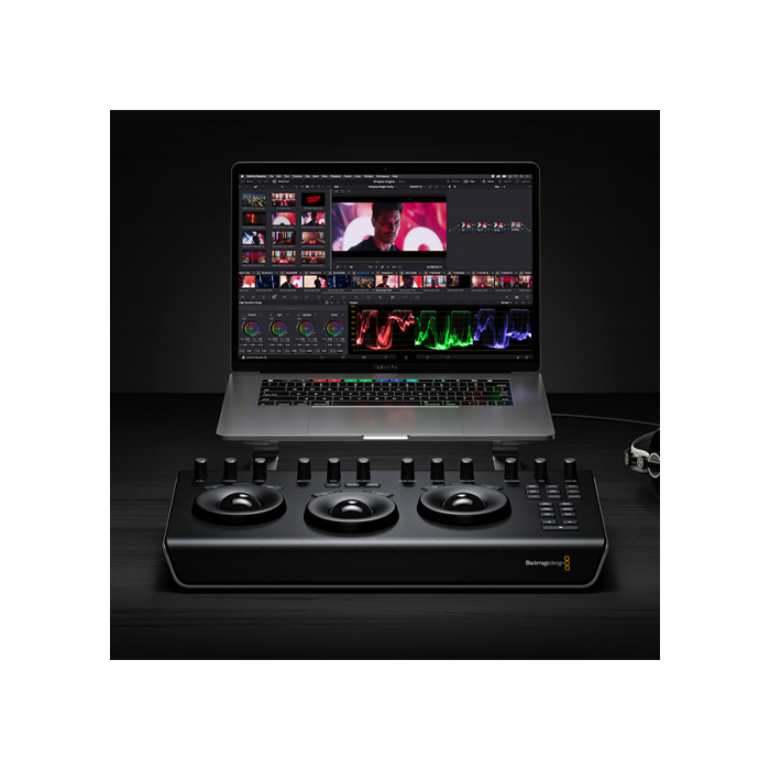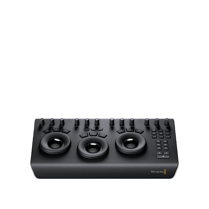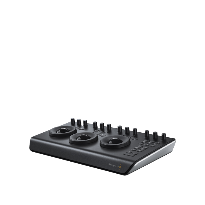 A remarkably small, portable hardware control panel, DaVinci Resolve Micro Panel has 3 high resolution weighted trackballs, 12 control knobs for essential tools, 18 dedicated navigation and transport keys, and more.