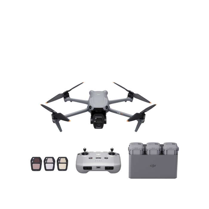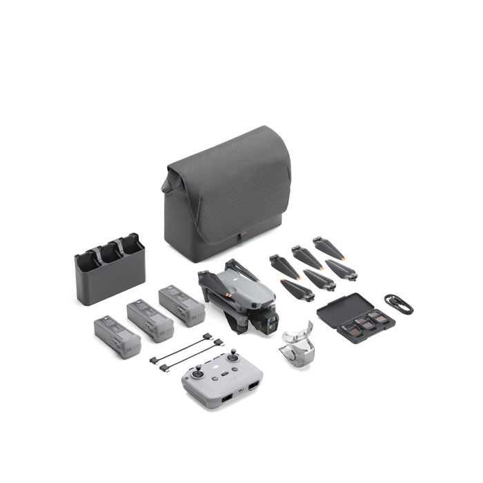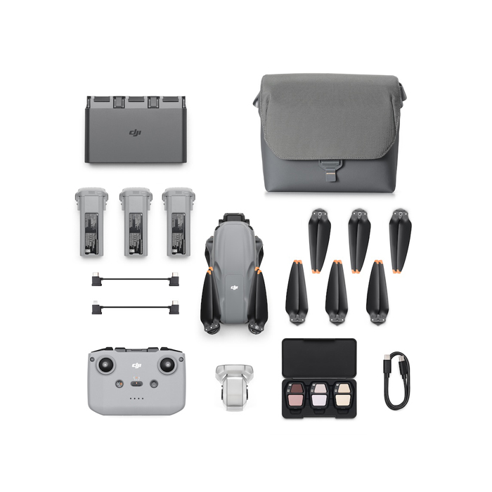 Includes the DJI RC-N3 remote controller, an ND filter set, two additional batteries, a battery charging hub, a shoulder bag, and more.