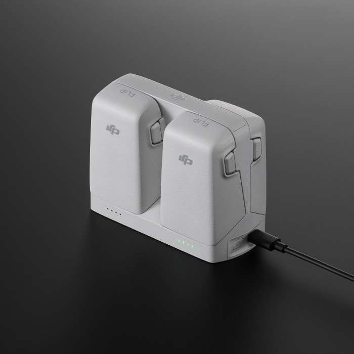 With the DJI Flip Parallel Charging Hub you can store and charge batteries. When used with the DJI 65W Portable Charger, it can fully charge 2 Intelligent Flight Batteries simultaneously in just 70 minutes.