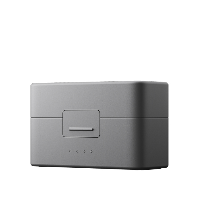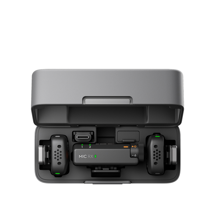 The compact DJI Mic Mini features an innovative design for easy storage. The charging case can neatly store two transmitters, one receiver, mobile phone adapters, and windscreens. The windscreens on the transmitters do not need to be removed when stored in the case. The entire set is convenient to use and easy to store.