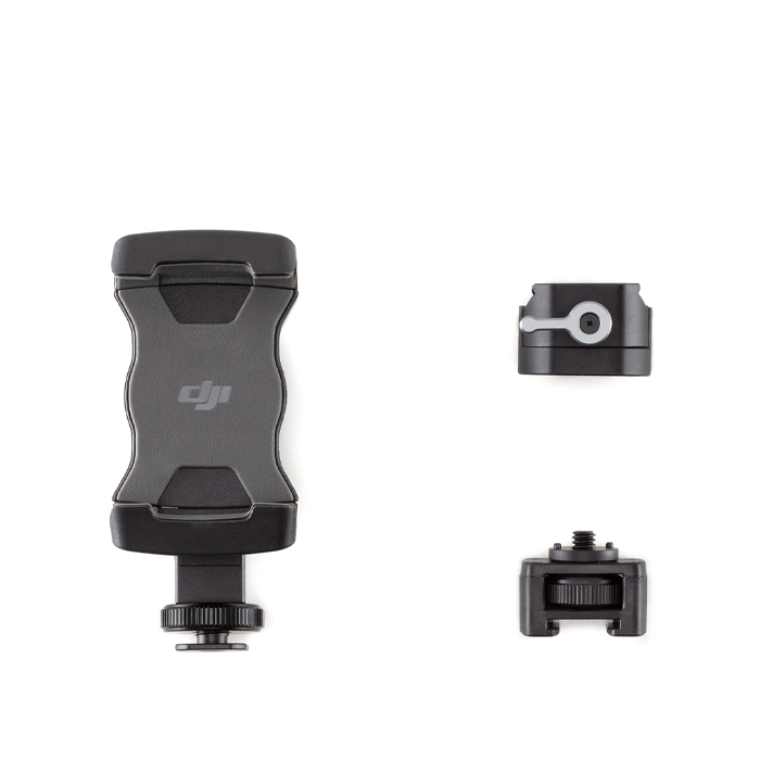 The DJI R Phone Holder secures the smartphone for monitoring, ActiveTrack 3.0, or Force Mobile. Equipped with a cold shoe port, NATO port, and 1/4"-20 tapped holes, the Phone Holder rotates between horizontal and vertical positions for convenient monitoring.
