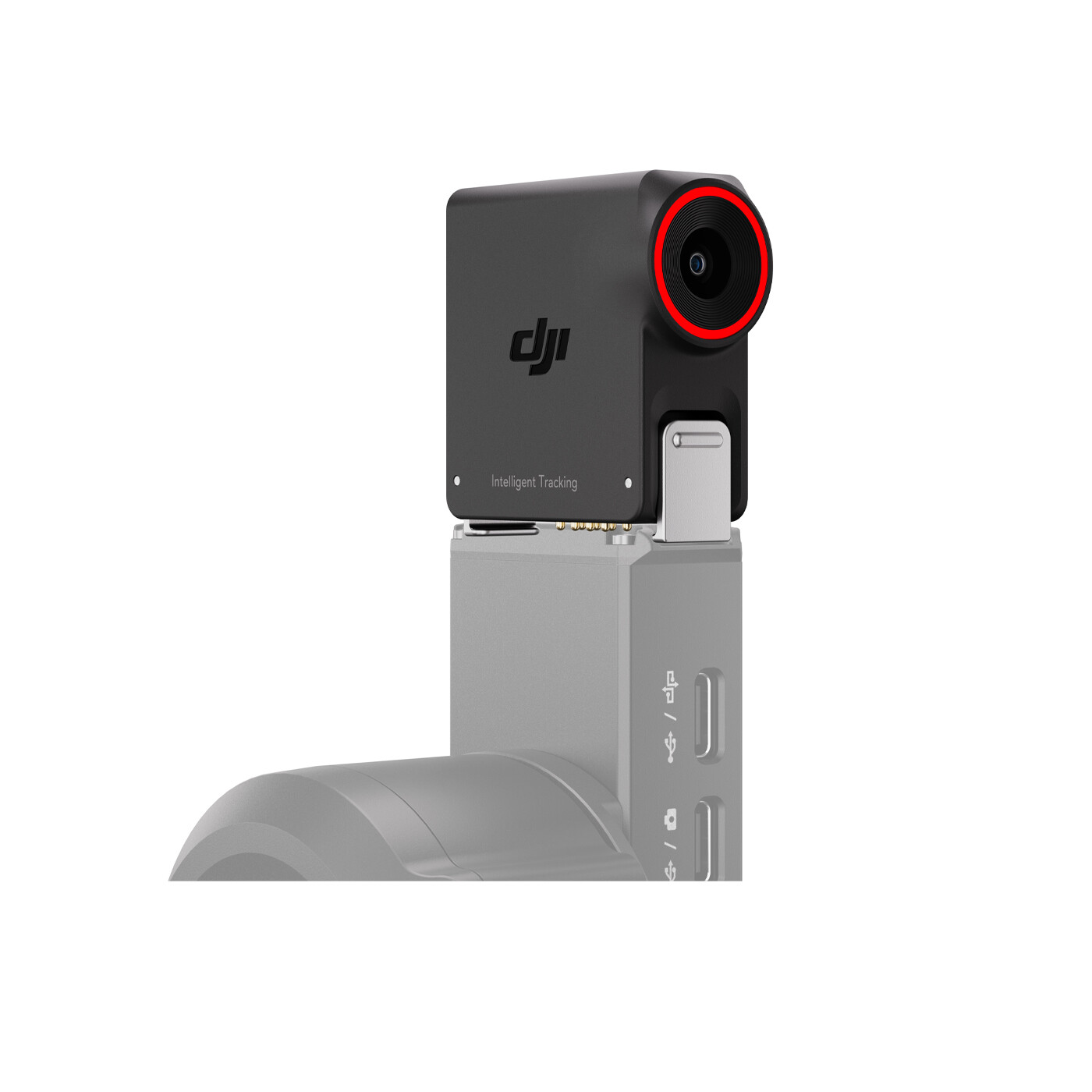 Bunden af RS tracking-modulet benytter et magnetisk låsedesign. Tryk på låsene og fastgør det øjeblikkeligt til DJI RS 5 eller DJI RS 4 Mini. Med Adapter Mount kan det også monteres og bruges med DJI RS 4 Pro eller DJI RS 4. Bemærk, at brug af Adapter Mount optager gimbalens RSS-port, så kamerakontrol-kablet ikke kan anvendes.