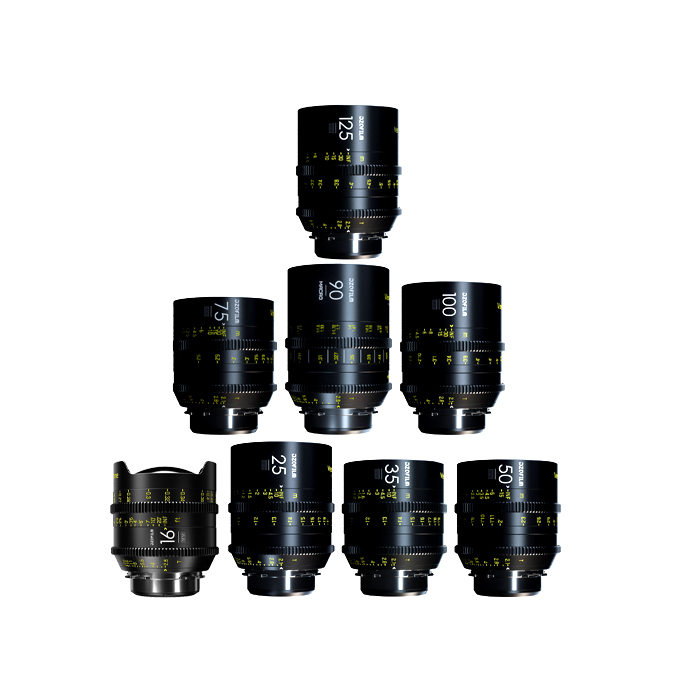 Cinematic capturing beyond full frame (46.5m). Compact and potable. Convenient for documentary shooting. The kit includes 16mm T2.8, 25mm, 35mm, 50mm, 75mm, 100mm, 125mm T2.1 and Macro 90mm T2.8.