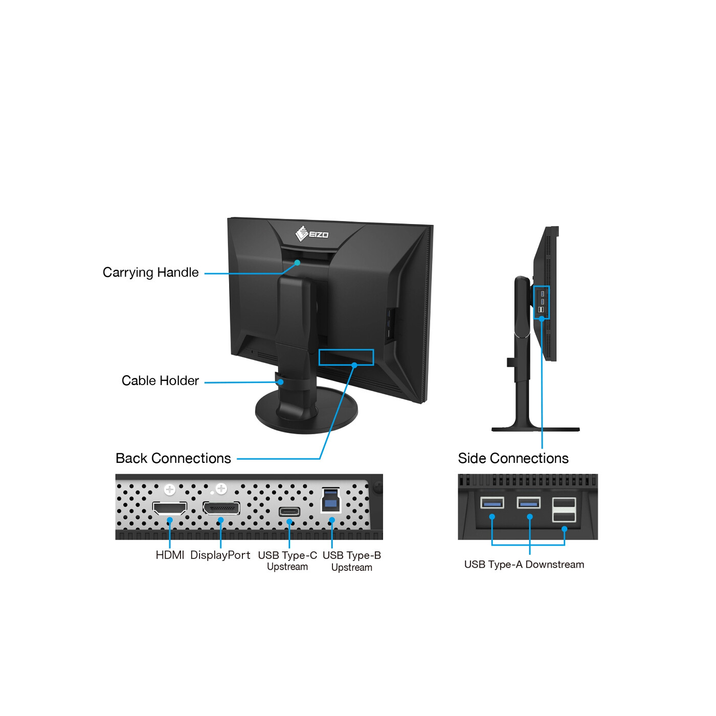 The monitor's outer design features a sleek cabinet with rounded edges and a non-intrusive stand base, allowing it to fit comfortably in any creative environment, while a carrying handle on the back allows you to easily move it to other locations. In addition to USB Type-C, the monitor is equipped with DisplayPort and HDMI inputs. It also includes four USB ports (USB 5Gbps: Type A x 2, USB 2.0: Type-A x 2) that are easily accessible from the side for connecting additional devices or peripherals.
