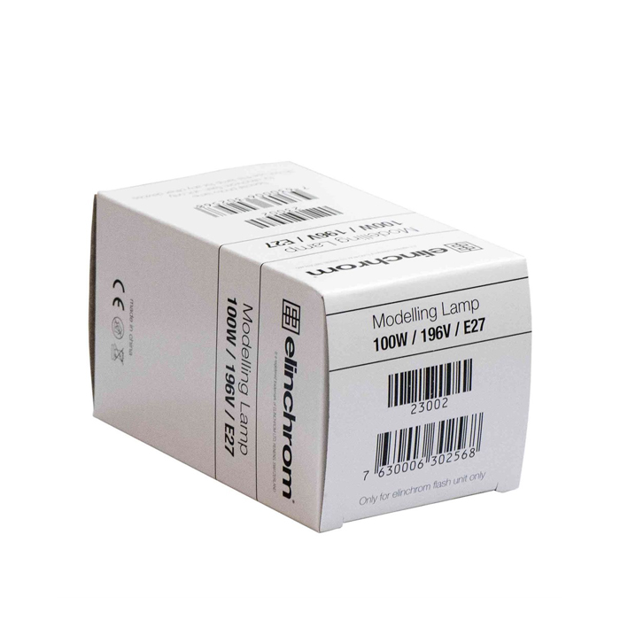 Elinchrom indstillingslampe 100W/196V med sokkel E27. Elinchromlampen, standard for alle mindre/ældre kompaktaggregater, pga. af sin kryptonform dækkes en del af flashrøret og man får et noget blødere lys. Flashlyset og indstillingslyset passer bedre end andre instillingslamper.