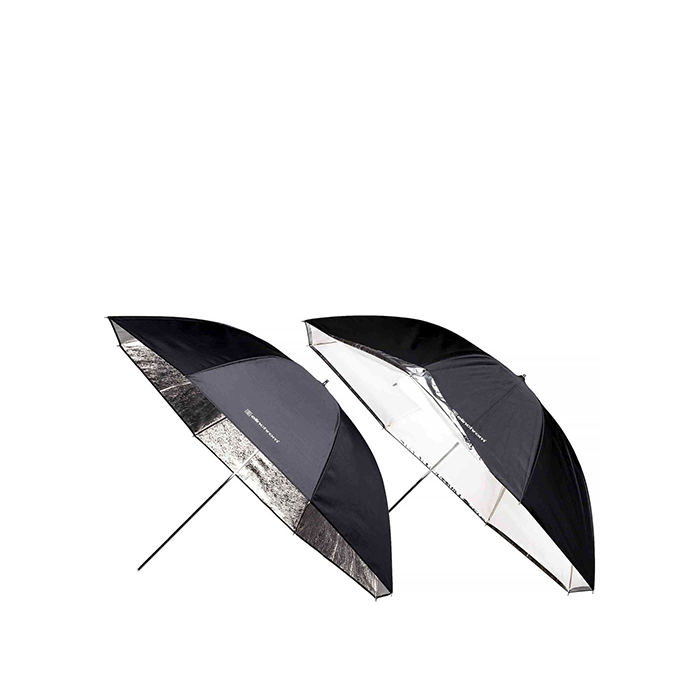 Kit with two Umbrellas 105 cm in Silver and White/Translucent. Silver for more contrast and intense lighting. Translucent as a shoot-through or bounce for soft and wide even spread with the unique option of keeping the cover on to make it white for a more neutral and soft look.