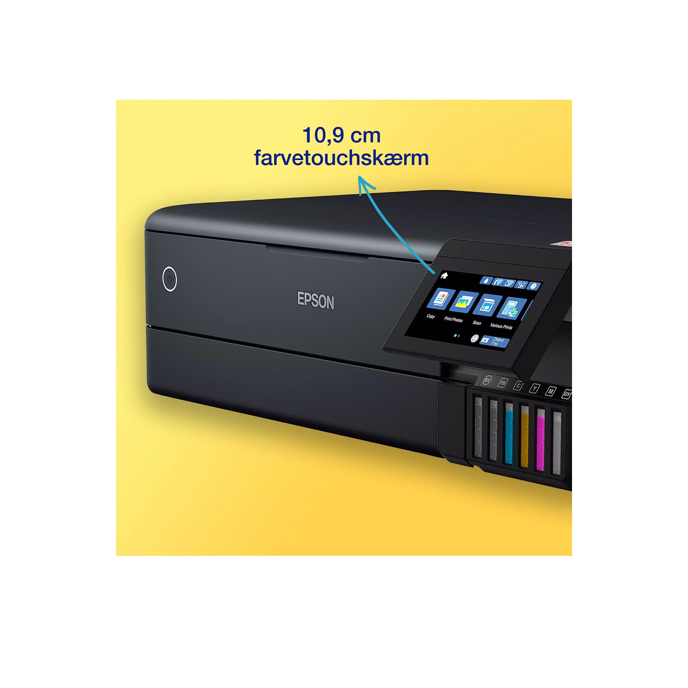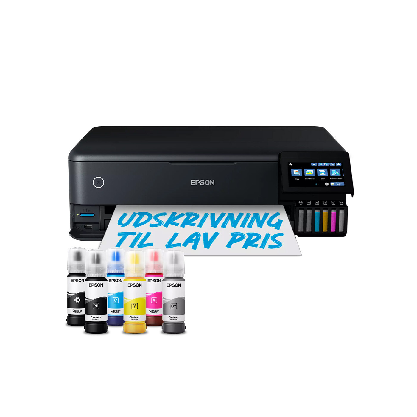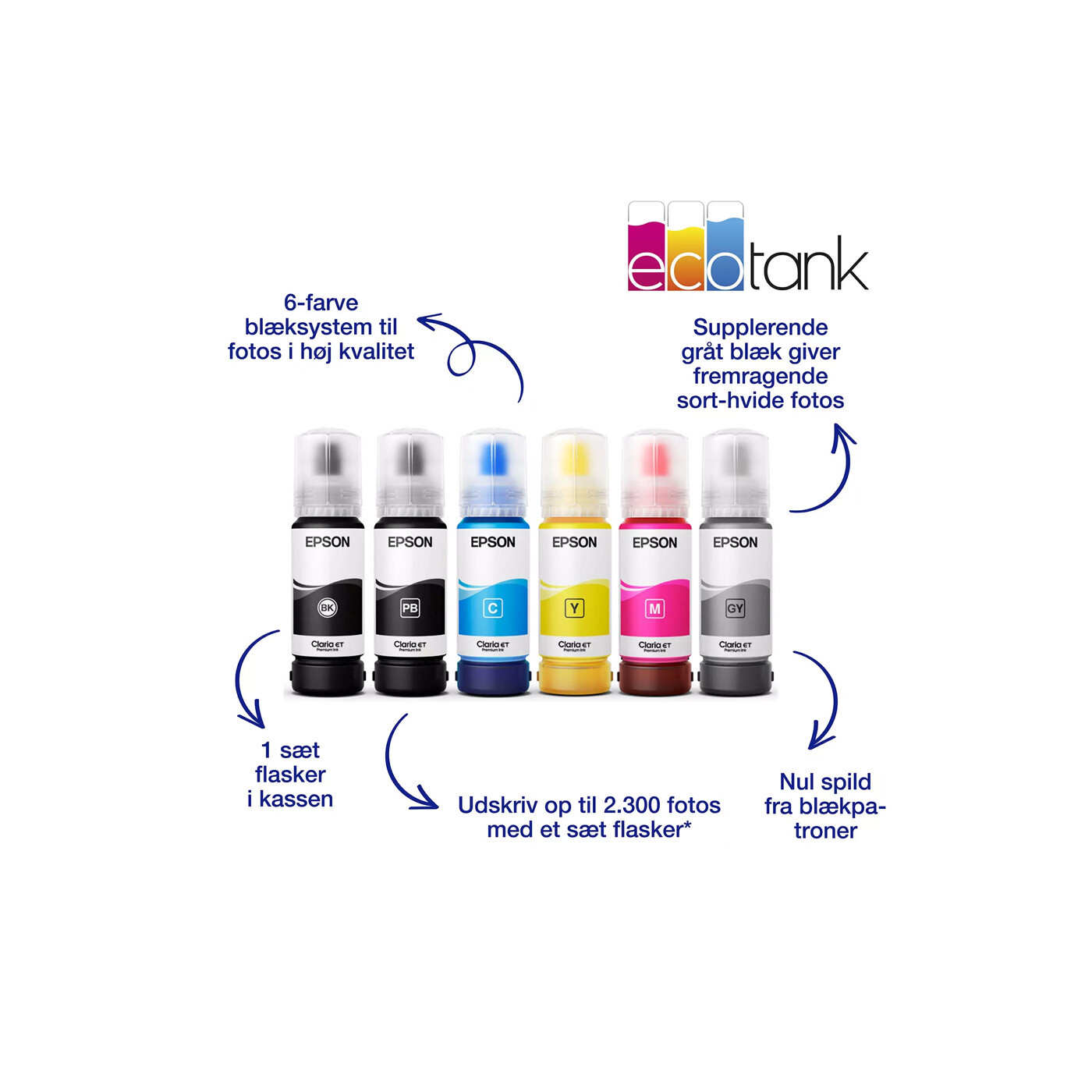 Epson Claria ET Premium-blæk sikrer fotos i høj kvalitet – både i farve og sort-hvid – helt op til A3+. Med en ny grå blæk bliver sort-hvide billeder ekstra detaljerede, mens pigmentbaseret sort blæk giver skarp tekst på almindeligt papir.