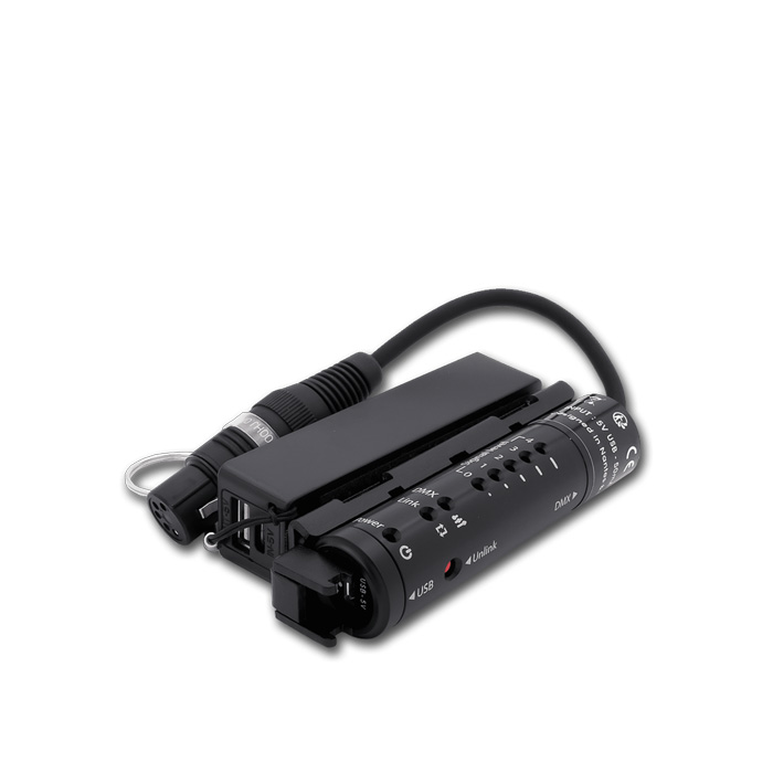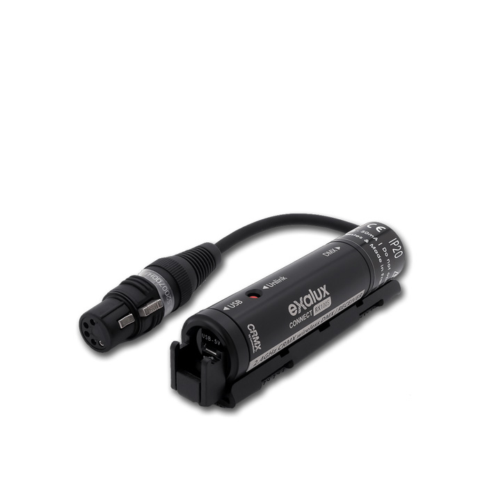 Exalux™ Connect RX100S er en kompakt trådløs DMX-modtager, der er specielt designet til at blive strømforsynet via USB-porten på en LED-panel. Alternativt kan den køre op til 10 timer ved brug af en lille PowerBank.