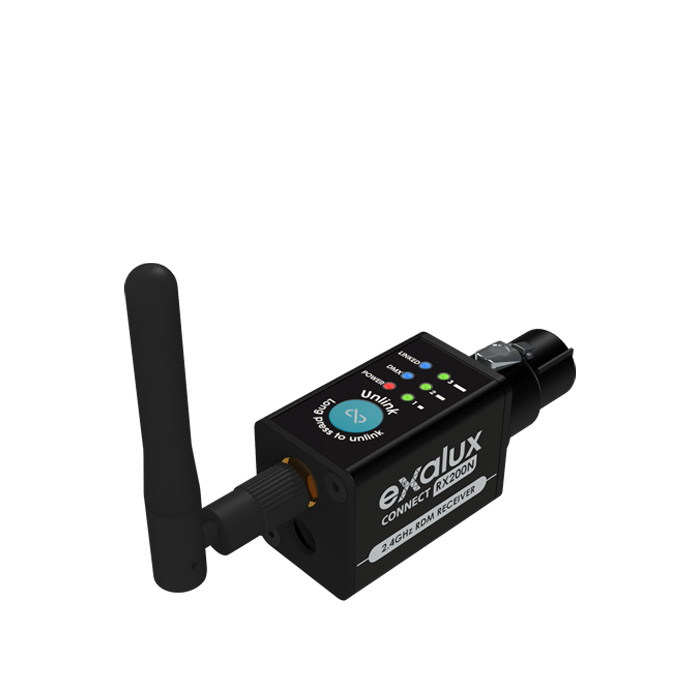 Exalux™ Connect RX200N er en ultrakompakt trådløs RDM/DMX-modtager, der er fuldt kompatibel med både RDM og DMX512. Dette gør enheden fremtidssikret, da den ikke blot kan modtage DMX-signaler, men også understøtter konfiguration, statusovervågning og styring af RDM-enheder.