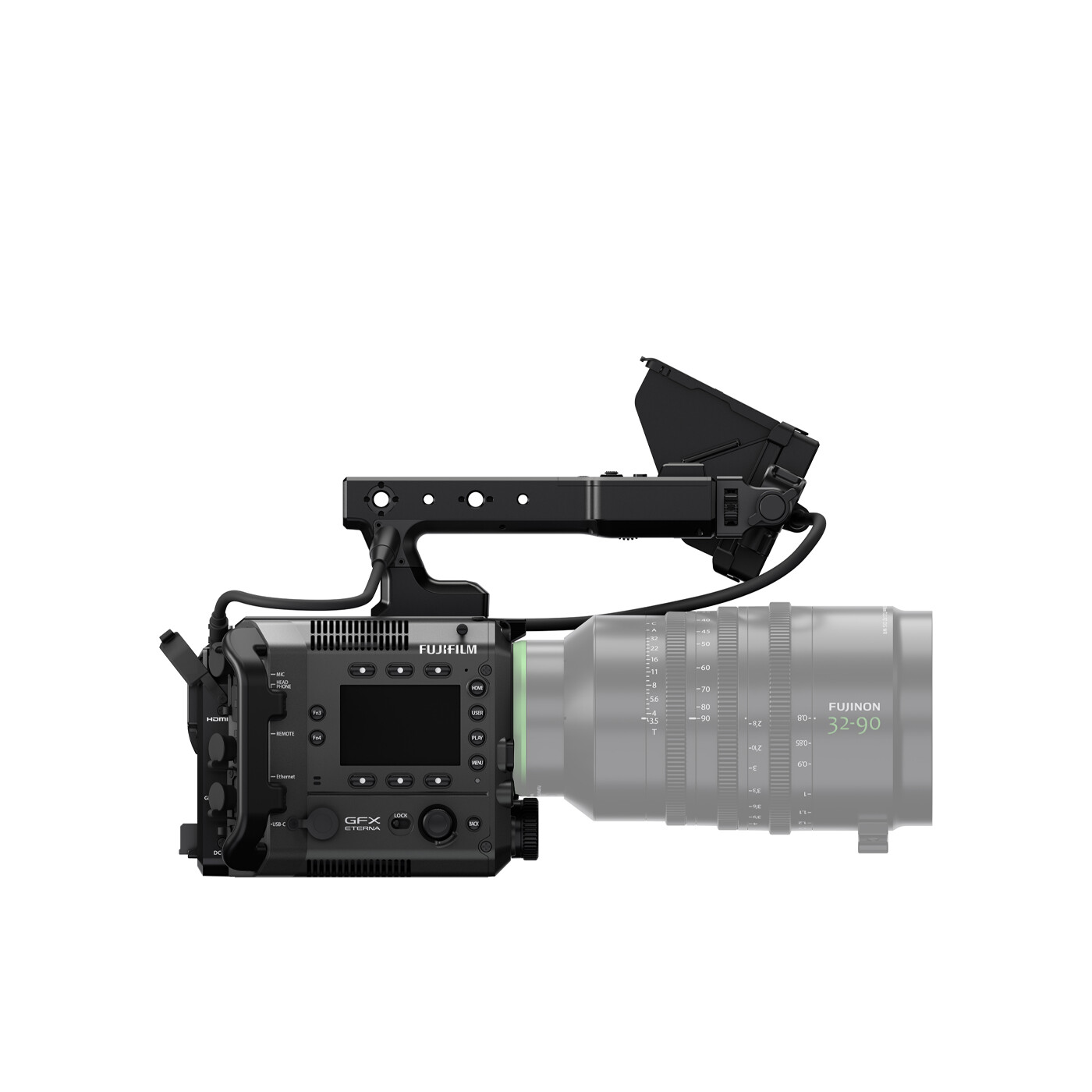 Til GFX ETERNA 55 medfølger en 5” ekstern LCD med 2000 nits lysstyrke, touch og fleksibel montering. Desuden findes 2 stykker 3” monitorer på operatør og assistent siden, som viser optagestatus, eksponering, lydniveauer og formater i realtid. Dermed kan både kameraoperatør og assistent overvåge kritiske data samtidigt.