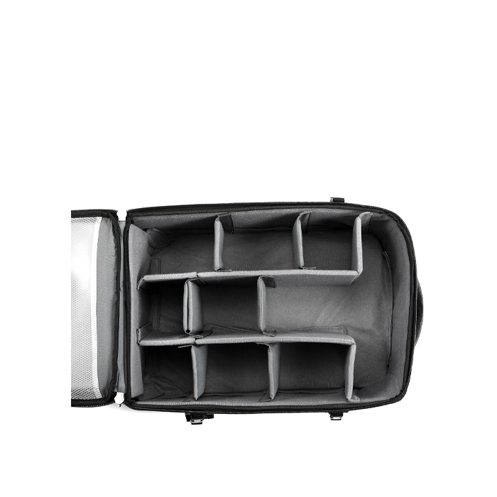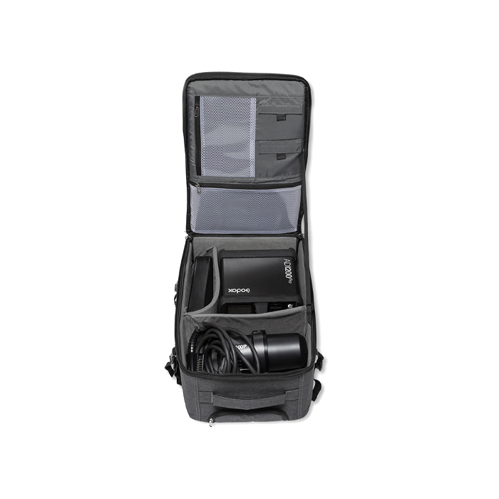 Hard roller bag and backpack in one - for AD1200Pro Kit, battery charger, AC adapter, portable flash head and transmitter. The 37 x 55 x 30cm compact case can fit one AD1200 Pro flash head, one battery-powered base, and the related accessories. It features a folding handle and casters for easy transport, plus two exterior zippered pockets, and a pair of exterior straps for attaching a light stand or tripod.