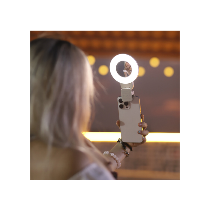 LR30BI Litemons Bi-Color Selfie LED Ring Light fra Godox er en kompakt bi-color LED-lampe, der gør det muligt for creators at tilføje fill light til både foto- og videooptagelser. Vælg en farvetemperatur fra varmt stearinlyslys på 2800K til køligt dagslys på 6500K med en af fem justerbare lysstyrkeniveauer, så lyset passer til enhver optagelsessituation. LR30BI har et vipbart hoved med et aftageligt makeupspejl, som gør den ideel til selfies og vlogging. Fastgør den til en smartphone, tablet eller anden overflade for at skabe et effektivt højlys.