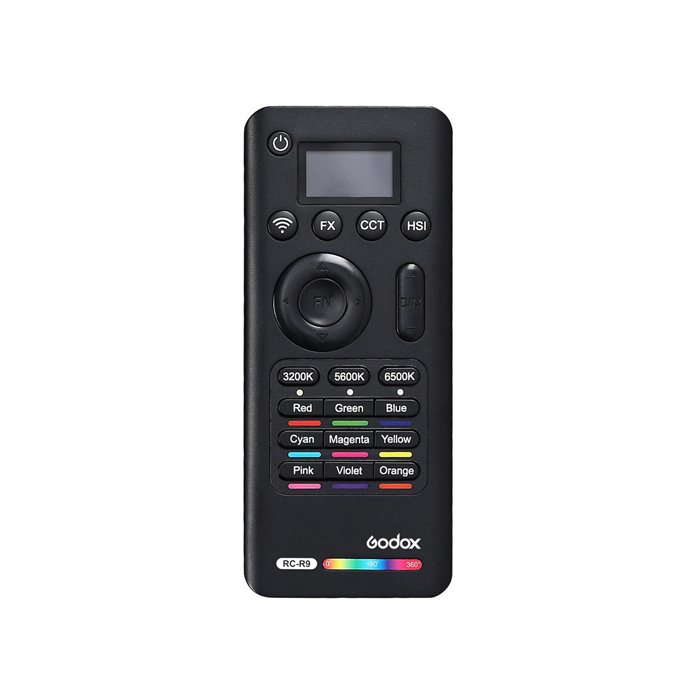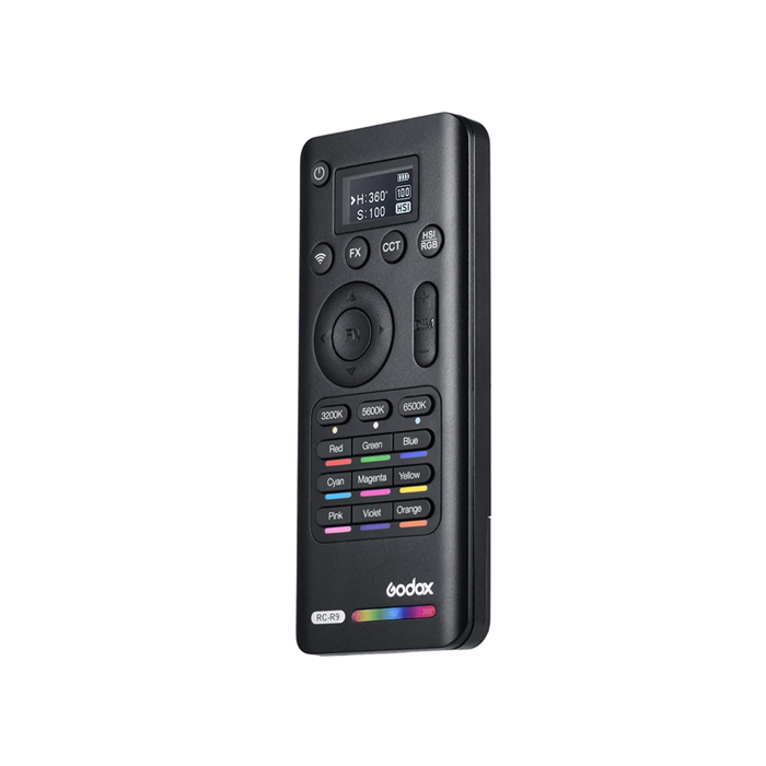 Control the Godox LED RGB Lights from ace with the Godox RC-R9 Remote Control. You can adjust the color and brightness of the light stick with the 2.4GHz remote control. The remote control has 32 channels and 16 groups. It is powered by two AAA batteries. These are not supplied with this product.