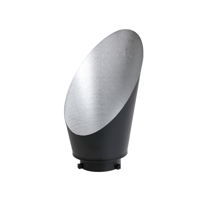 The reflector is cut, which allows you to position the lamp on the side of the plan. Fits all flash and continuous lighting that use the Bowens mount.