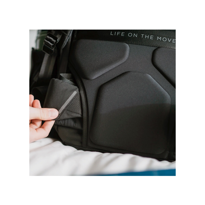 Rygsækken kan udvides fra 32 l til 41 l og rumme tøj til op til fem dage samt en laptop på 17". Den forreste sektion bruges til dit elektroniske udstyr, ledninger og andre småting og har flere lommer i trådnet og med lynlås, herunder en sikker lomme til RFID-udstyr.