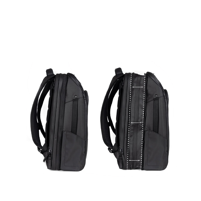 Tasken er tynd men kan udvides fra 20 l til 30 l, når du skal bruge mere bagageplads. Stropsystemet (patentansøgning indgivet) giver dig mulighed for at skifte fra rygsæk til attachétaske.