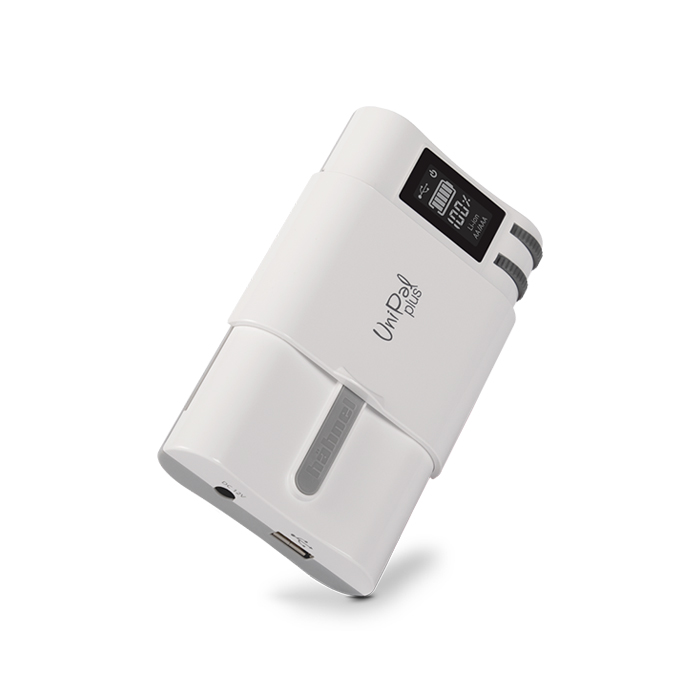 Den meget alsidige, opgraderede UniPal Plus er en universaloplader med et LCD-display. Strømforsyning med udskiftelige stik til EU, Storbritannien, USA og Australien medfølger.