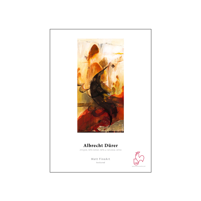 Hahnemühle Albrecht Dürer is a genuine mould-made paper made from 50% cotton and 50% α-cellulose fibres. The traditional mould-made art paper is refined with a coating specially developed for FineArt applications. The white FineArt inkjet paper does not contain optical brighteners and has a classic, strikingly defined watercolour structure that adds an artistic touch to art reproductions in particular. Combined with the matt premium inkjet coating, this produces impressive FineArt prints boasting vivid colours, deep black and optimum reproduction of detail. The acid- and lignin-free Albrecht Dürer FineArt inkjet paper meets the most exacting requirements for age resistance.