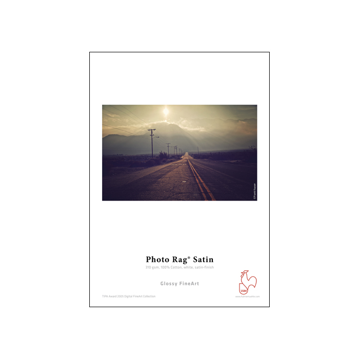Photo Rag® Satin is characterised by its very unique coating. The printed areas have a soft sheen, while the unprinted areas remain matt to beautifully accentuate brilliance. Photo Rag® Satin is acid- and lignin-free which meet the most exacting requirements in terms of age resistance.